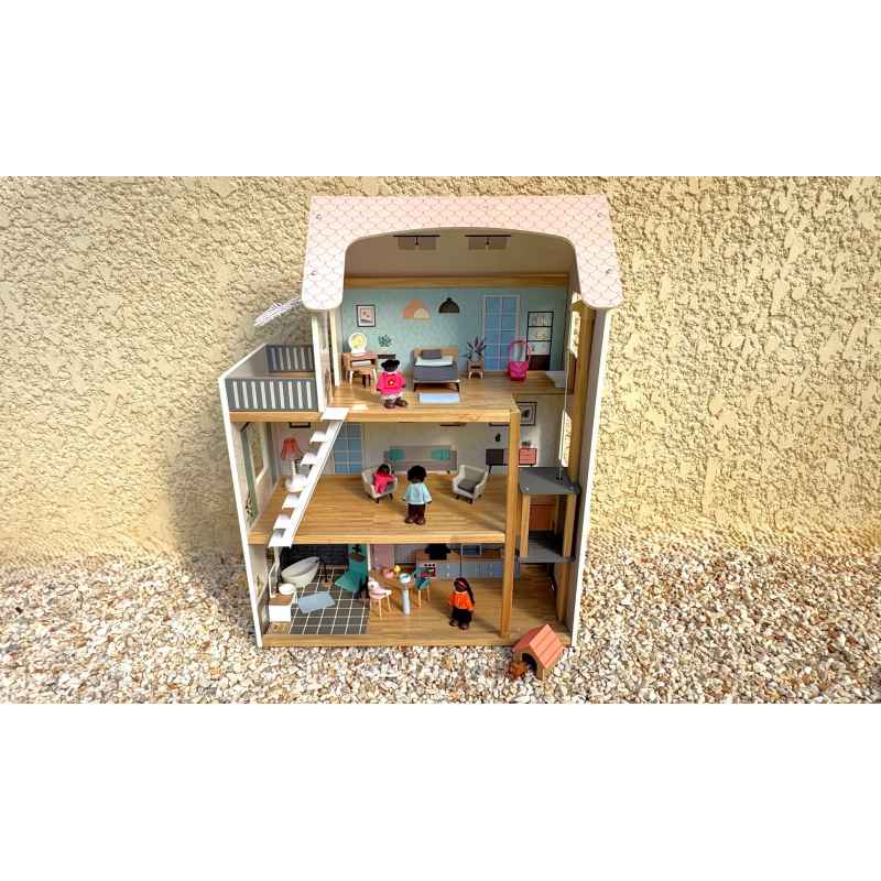 grande maison de poupée en bois avec ascenseur manuel + mobilier + figurines + accessoires + 1 sonnette qui fait des sons. Dimensions: 80/61/31 cm en bon état voir très bon. Sera démonté si par envoi.