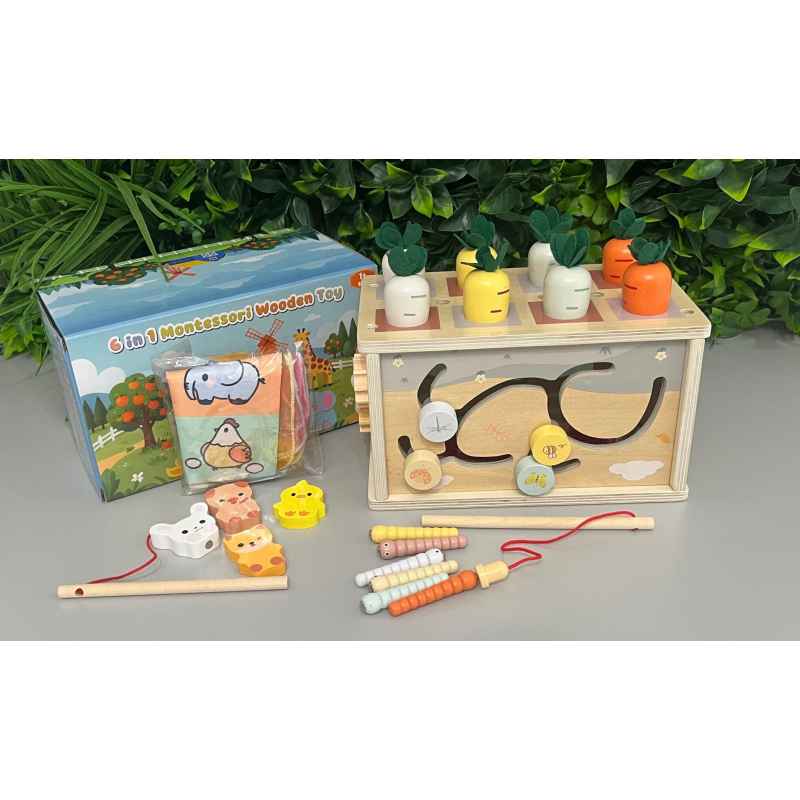 bloc en bois multi activités type montessori avec 6 faces avec fonctions différentes, comprend 3 blocs en bois à forme d'animaux, 4 serviettes en papier douces, 1 tissu claquant, 6 petits vers, 8 carottes et 1 canne à pêche. En tant que jeu montessori d'éveil 6 en 1 spécialement conçu pour les bébés à partir de 1 an. Neuf ( juste un éclat sur le bois au niveau d'une ouverture)