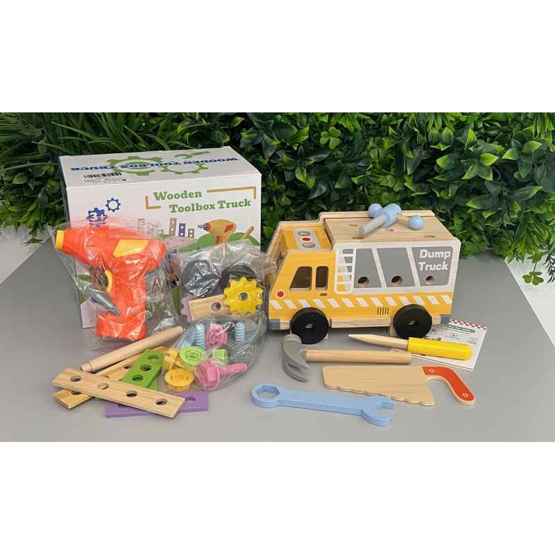 camion benne en bois de 40 pièces qui fait aussi établi + outils + perceuse à piles qui visse et dévisse , le tout dans sa boite , neuf