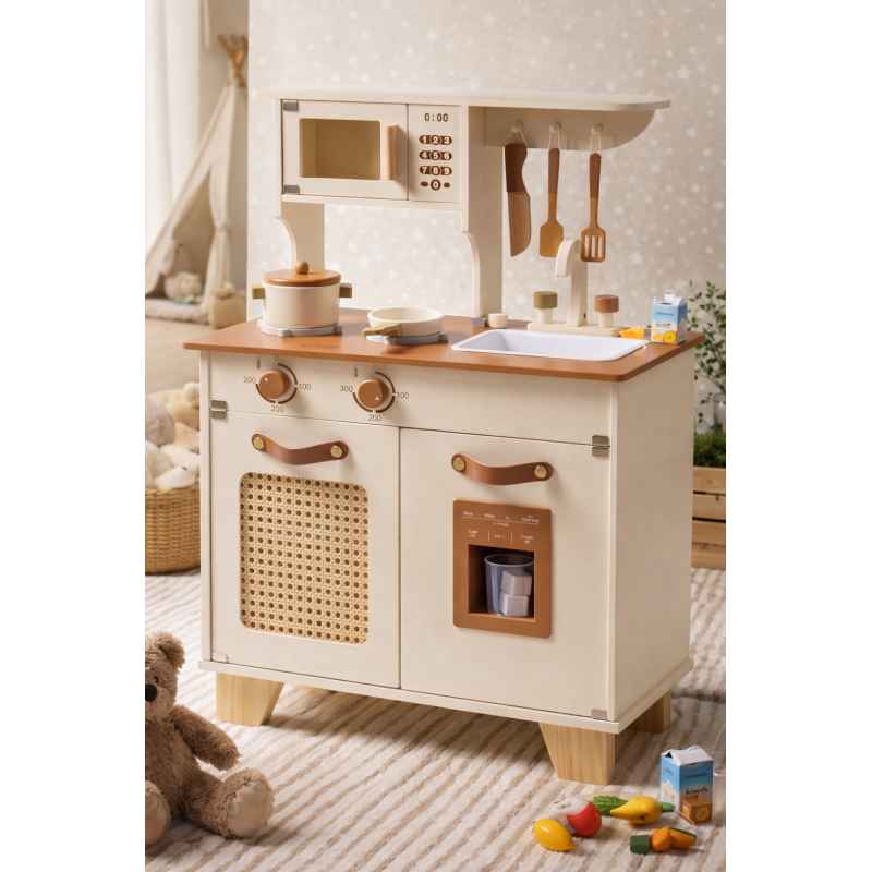 grande cuisine en bois couleur crème en bois et rotin de 79x55.5x28 cm avec plaques, micro ondes, distributeur de glaçons, évier et ustensiles, le tout neuf dans son carton, jamais monté