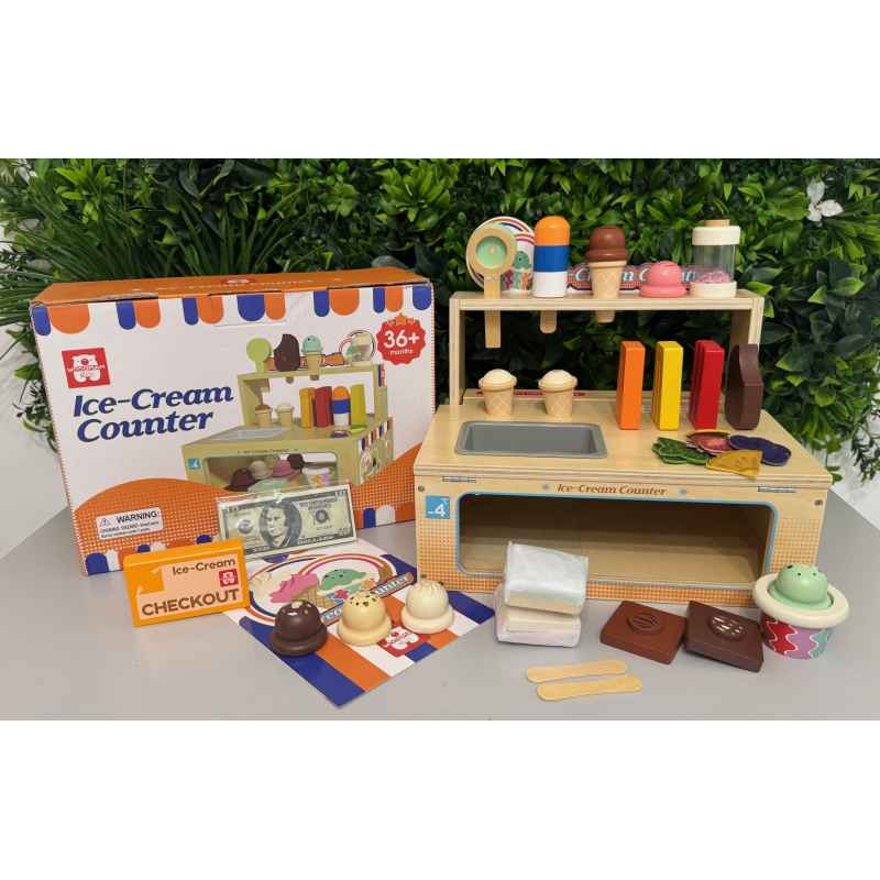 stand à glaces en bois avec comptoir + cornets, glaces, batônnets, menu, billets... neuf