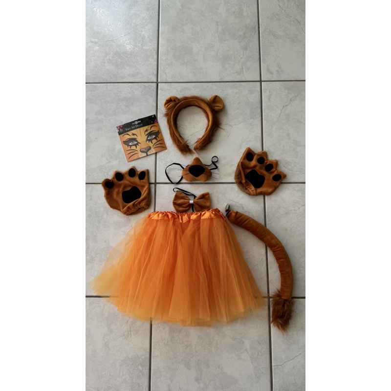 déguisement de lion avec jupe, serre tête, nez, pattes, nœud, queue détachable et autocollants, en 3/7 ans, neuf
