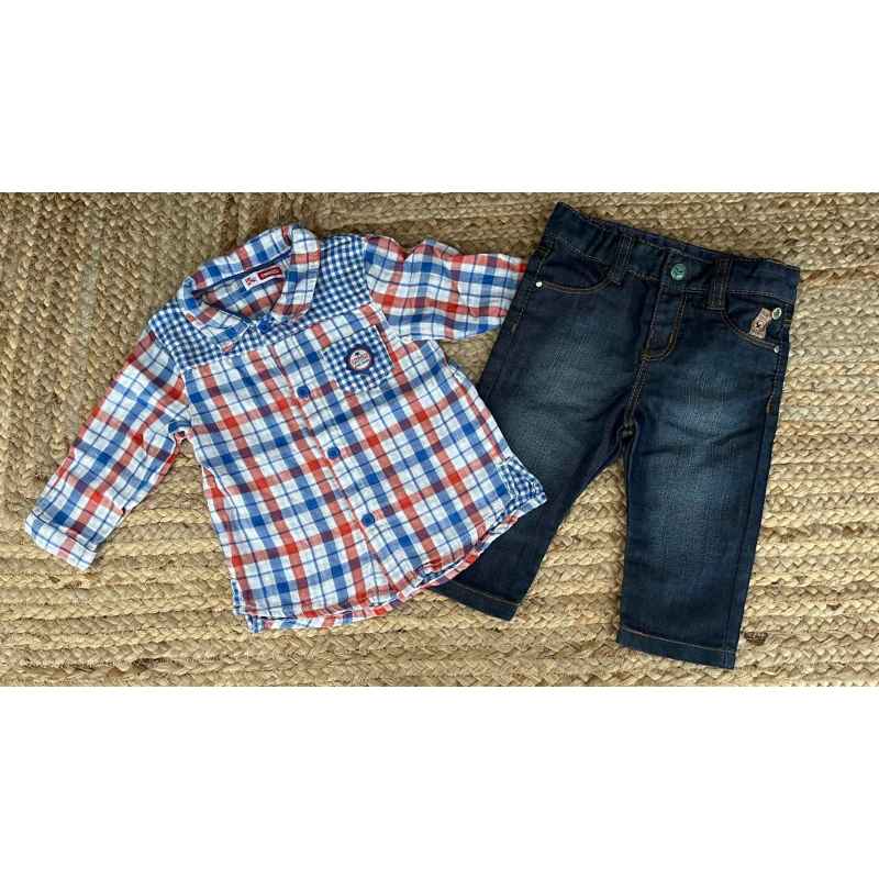 ensemble dpam composé d'une chemise à carreaux + 1 jeans , réglable à la taille en tbe en 6 mois