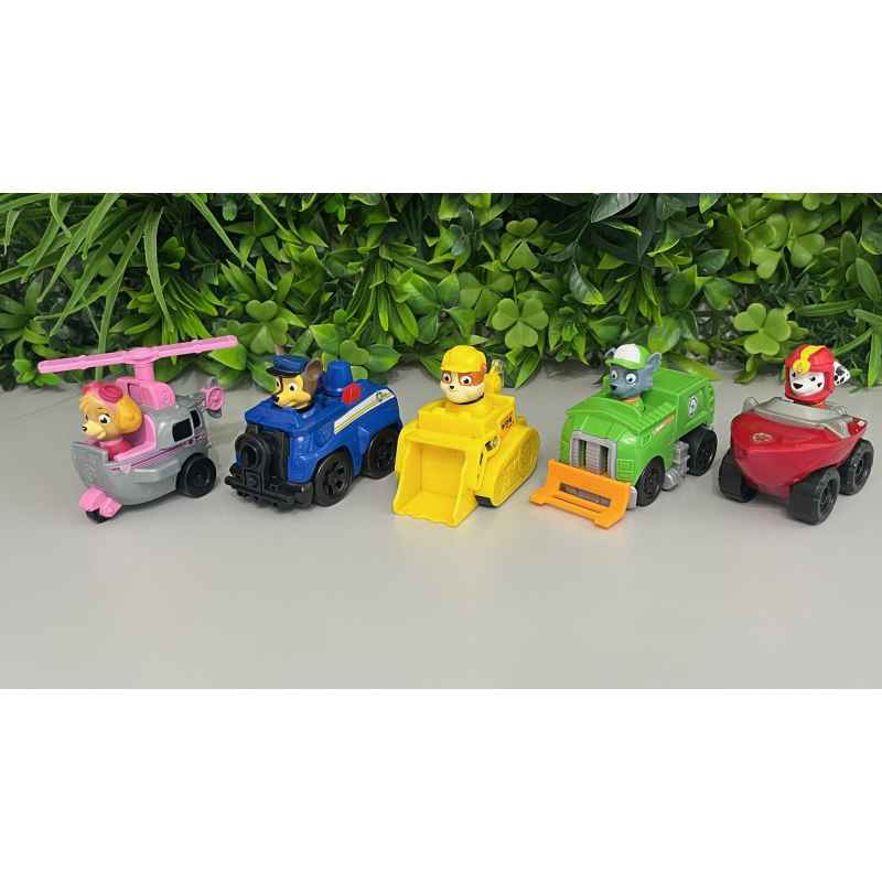 5 véhicules de la pat patrouille qui roulent avec figurines non amovibles d'environ 9 cm en bon état