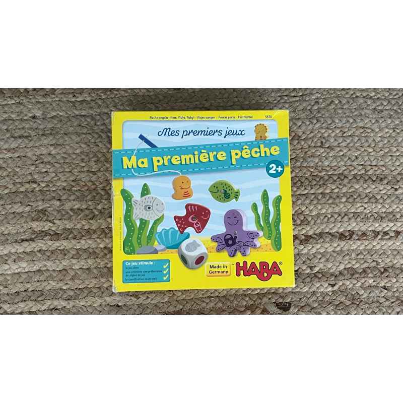 ma première pêche haba en bois avec sa canne , son dé et ces 6 poissons en bon état juste la boite a été scotchée et il n'y a pas de plaquette de jeu