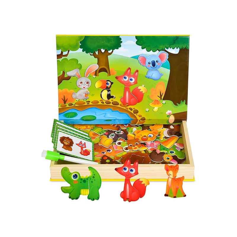 tableau magnétique double face refermable te transportable où l'on peut d'un coté dessiner ou écrire avec un stylo effaçable (fourni) et de l'autre coté créer des scènes ou tableaux avec les aimants animaux fournis , le tout neuf