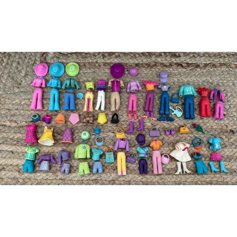 lot de 120 accessoires polly pocket avec tenues, chaussures, sacs, chapeaux et autres, tous en bon état sauf un haut abimé derrière