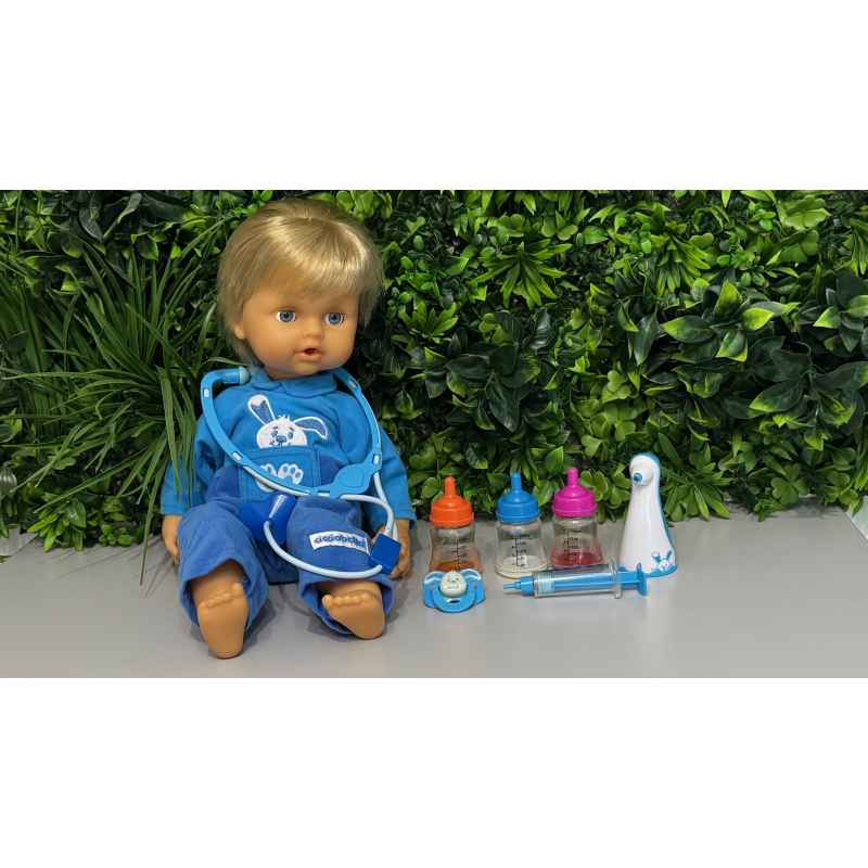 poupon ciocciobello bobo avec sucette, thermomètre , biberon de lait, sirops et stéthoscope et seringue. Le poupon pleure , fait des bruits et a les joues qui deviennent rouges en bon état