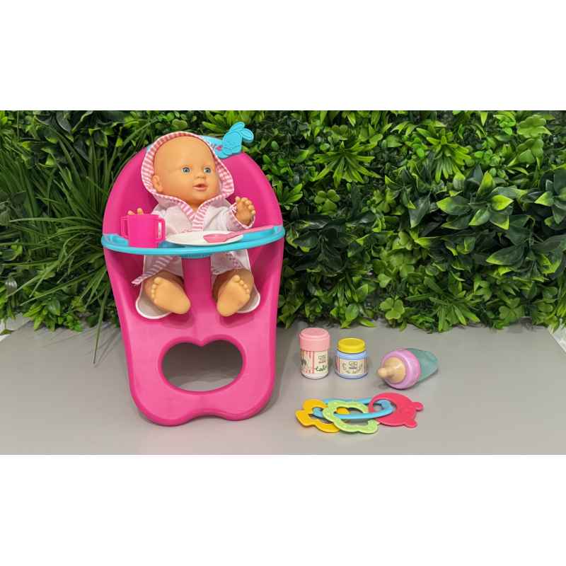 chaise haute pour poupon repliable 36 cm de haut + accessoires + 1 poupon articulé de 30 cm de haut, le tout en bon état