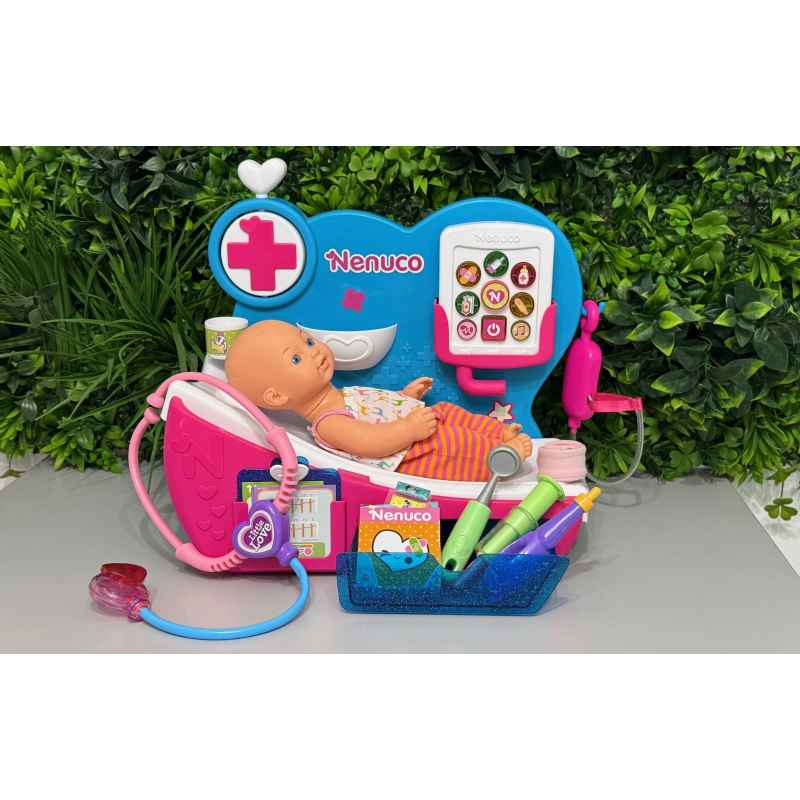 centre médical nenuco avec tous les accessoires nécessaires à l'auscultation + table pour allonger le poupon avec tiroirs + 1 tablette électronique mais comme le poupon ne correspond pas, elle ne produit que des sons de pleurs+ 1 poupon de 29 cm de long, le tout en bon état